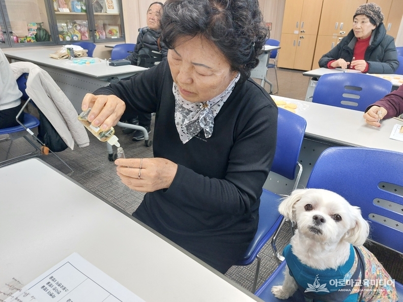 교육 과정에서는 펫 아로마테라피의 기초 이론을 바탕으로, 반려동물의 특성과 생활 환경을 고려한 제품 제작 실습이 함께 이루어진다. 특히 향에 민감한 반려동물을 위해 저자극·저농도 사용 원칙과 안전한 적용 방법을 중심으로 설명해, 어르신들도 쉽게 이해하고 실생활에 적용할 수 있도록 했으며, 수업에 참여한 어르신들은 “반려동물을 위해 직접 만들어본다는 점이 뜻깊다”, “혼자 사는 일상 속에서 반려동물과의 교감 시간이 더 소중해졌다”는 반응을 보이며 높은 만족도를 나타내었다.